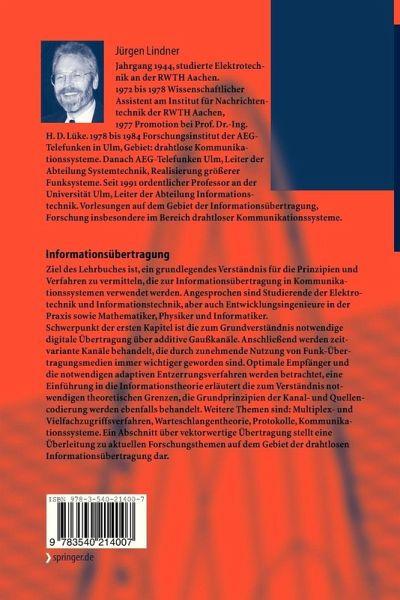 Ziel des Lehrbuchs Informationsübertragung ist es, ein grundlegendes Verständnis für die Prinzipien und Verfahren zu vermitteln, die in Kommunikationssystemen heute verwendet werden. Neben den notwendigen Grundlagen wird in den ersten Kapiteln schwerpunktmäßig die digitale Übertragung über additive Gaußkanäle behandelt und darauf aufbauend die Modellierung von zeitvarianten Übertragungskanälen, die beim heutigen Mobilfunk eine wichtige Rolle spielen. Optimale und suboptimale Empfänger mit Entzerrungsverfahren wie Viterbi-MLSE und DFE werden betrachtet.