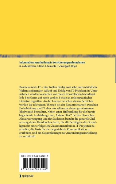 Business meets IT - hier treffen häufig zwei sehr unterschiedliche Welten aufeinander. Ablauf und Erfolg von IT-Projekten in Unternehmen werden wesentlich von dieser Konstellation beeinflusst. Jede Seite kann auf einen großen Schatz an rollenspezifischer Literatur zugreifen. An der Grenze zwischen diesen Bereichen werden die relevanten Themen bei der Zusammenarbeit zwischen Fachabteilung und IT aber nur selten aus einem gemeinsamen Blickwinkel betrachtet. Neben einer Hilfestellung für die berufsbegleitende Ausbildung zum "Aktuar DAV" bei der Deutschen Aktuarvereinigung und für Studenten besteht die generelle Zielsetzung dieses Handbuches darin, für alle Beteiligten die Grundlagen für eine erfolgreiche Zusammenarbeit in IT-Projekten zu schaffen, die Basis für die zielgerichtete Kommunikation zu erarbeiten und ein Gesamtkonzept zur Anwendungsentwicklung zu vermitteln.