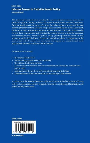 This important book proposes revising the current informed consent protocol for predictive genetic testing to reflect the trend toward patient-centered medicine. Emphasizing the predictive aspect of testing, the author analyzes the state of informed consent procedure in terms of three components: comprehension of risk assessment, disclosure to select appropriate treatment, and voluntariness. The book's revised model revisits these cornerstones, restructuring the consent process to allow for expanded comprehension time, enhanced patient safety, greater patient involvement and autonomy, and reduced chance of coercion by family or others. A comparison of the current and revised versions and case studies showing the new model in real-world applications add extra usefulness to this resource.