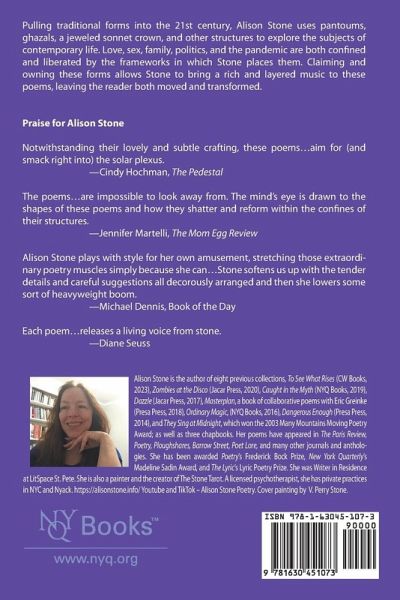 Pulling traditional forms into the 21st century, Alison Stone uses pantoums, ghazals, a jeweled sonnet crown, and other structures to explore the subjects of contemporary life. Love, sex, family, politics, and the pandemic are both confined and liberated into the frameworks in which Stone places them. Claiming and owning these forms allows Stone to bring a rich and layered music to these poems, leaving the reader both moved and transformed. Pulling traditional forms into the 21st century, Alison Stone uses pantoums, ghazals, a jeweled sonnet crown, and other structures to explore the subjects of contemporary life. Love, sex, family, politics, and the pandemic are both confined and liberated into the frameworks in which Stone places them. Claiming and owning these forms allows Stone to bring a rich and layered music to these poems, leaving the reader both moved and transformed.
