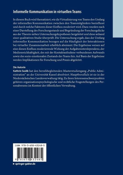 In diesem Buch wird thematisiert, wie die Virtualisierung von Teams den Umfang der informellen Kommunikation zwischen den Teammitgliedern beeinflusst und durch welche Faktoren dieser Einfluss moderiert wird. Dazu wurden nach einer Darstellung des Forschungsstands und Begründung der Forschungslücke aus der Theorie sieben Untersuchungshypothesen hergeleitet und diese anhand einer qualitativen Studie überprüft. Die Untersuchung ergab, dass der Umfang informeller Kommunikation bezogen auf die Häufigkeit der Interaktionen bei virtueller Zusammenarbeit erheblich abnimmt. Die Ergebnisse weisen auf eine diesen Einfluss moderierende Wirkung der Aufgabeninterdependenz, der Medienreichhaltigkeit, des mit der Kontaktaufnahme verbundenen Aufwands sowie des sozio-emotionalen Zustands des Teams hin. Auf Basis der Ergebnisse werden Implikationen für Forschung und Praxis abgeleitet.