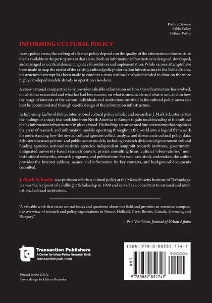 In any policy arena, the crafting of effective policy depends on the quality of the information infrastructure that is available to the participants in that arena. Such an information infrastructure is designed, developed, and managed as a critical element in policy formulation and implementation. While various attempts have been made to map the extent of the existing cultural policy information infrastructure in the United States, no structured attempt has been made to conduct a cross-national analysis intended to draw on the more highly developed models already in operation elsewhere.A cross-national comparative look provides valuable information on how this infrastructure has evolved, on what has succeeded and what has had less success, on what is sustainable and what is not, and on how the range of interests of the various individuals and institutions involved in the cultural policy arena can best be accommodated through careful design of the information infrastructure.In Informing Cultural Policy, international cultural policy scholar and researcher J. Mark Schuster relates the findings of a study that took him from North America to Europe to gain understanding of the cultural policy information infrastructure in place abroad. His findings are structured into a taxonomy that organizes the array of research and information models operating throughout the world into a logical framework for understanding how the myriad cultural agencies collect, analyze, and disseminate cultural policy data. Schuster discusses private- and public-sector models, including research divisions of government cultural funding agencies, national statistics agencies, independent nonprofit research institutes, government-designated university-based research centers, private consulting firms, cultural "observatories," non-institutional networks, research programs, and publications. For each case study undertaken, the author provides the Internet address, names, and information for key contacts, and background documents consulted.