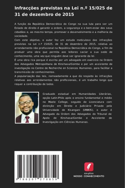 A função da República Democrática do Congo na sua luta para ser um Estado de direito é garantir a ordem, a segurança e o bem-estar dos seus cidadãos e, ao mesmo tempo, promover o desenvolvimento e a melhoria da sociedade.Com este objetivo, o autor fez um estudo meticuloso das infracções previstas na Lei n.º 15/025, de 31 de dezembro de 2015, relativa ao arrendamento não profissional na República Democrática do Congo, a fim de produzir uma obra que permita aos leitores saciar a sua sede de conhecimento, uma vez que ninguém deve ser ignorante da lei.É uma obra rica porque é escrita por um advogado em exercício na Ordem dos Advogados Metropolitana de Kinshasa/Gombe e por um assistente de investigação no Centre de Recherche en Sciences Humaines, para facilitar a transmissão de conhecimentos.A popularização das leis, nomeadamente a que diz respeito às infracções relativas aos arrendamentos não profissionais, é um trabalho longo que requer a contribuição de todos.