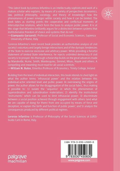 Building from the level of individual interaction, this book intends to shed light on what the author terms "infrasocial power" and the relation between this individual-actor oriented level and public power. In overviewing the origins of power, the author allows for the disaggregation of the social fabric, thus making it possible to: 1) isolate the "sequence" in which the phenomenon of superordination and subordination materialises; 2) identify the institutional "instruments" which can be used to limit infrasocial power; 3) discriminate between a social position achieved through engagement with others (and what we are capable of doing for them) from one occupied by means of force and deception; 4) explain the birth and function of public power; and 5) analyze the consequences produced by different political regimes.