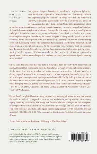 Set against critiques of neoliberal capitalism in the present, Infrastructural Attachments argues that the technopolitics of austerity have been the organizing logic of statecraft in Kenya since the late nineteenth century, calling into question the novelty of austerity as a mode of governance and a lived experience. Using infrastructures as a lens to explore state formation over the long twentieth century-roads in the early colonial period, radio broadcasting from the interwar through the postwar periods, and mobile phones and digital financial services in the present-historian Emma Park reveals that as the state drew on private capital to make up for limited budgets, it inaugurated a peculiar political-economic form: the corporate-state. For more than a century-in pursuit of minimizing costs and maximizing profits-the corporate-state crucially relied on the exploitation and expropriation of its subject-citizens. By foregrounding these workers, Park interrogates how Kenyans' knowledge and expertise has been rescaled and subsumed, quietly underwriting the development of infrastructural expertise, the circuits of finance upon which (post)colonial infrastructural expansion has been premised, and the forms of profit-making it has enabled.