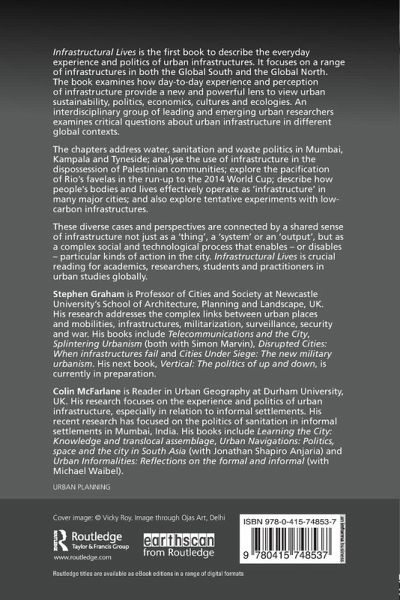 Stephen Graham is Professor of Cities and Society at Newcastle University's School of Architecture, Planning and Landscape, UK. His research addresses the complex links between urban places and mobilities, infrastructures, militarization, surveillance, security and war. His books include Telecommunications and the City, Splintering Urbanism (both with Simon Marvin), Disrupted Cities: When infrastructures fail and Cities Under Siege: The new military urbanism. His next book, Vertical: The politics of up and down, is currently in preparation. Colin McFarlane is Reader in Urban Geography at Durham University, UK. His research focusss on the experience and politics of urban infrastructure, especially in relation to informal settlements. His recent research has focused on the politics of sanitation in informal settlements in Mumbai, India. His books include Learning the City: Knowledge and translocal assemblage, Urban Navigations: Politics, space and the city in South Asia (with Jonathan Shapiro Anjaria) and Urban Informalities: Reflections on the formal and informal (with Michael Waibel).