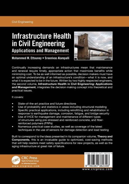 Taking appropriate timely actions requires good understanding of the infrastructure-its current and expected condition in the future. This book addresses practical applications, including retrofitting and rehabilitation due to earthquake damage, corrosion, and fatigue. It covers management and maintenance of different types of structures using prestressed and reinforced concrete, and fiber reinforced polymers (FRPs). It also examines the use of sensors in damage detection and load testing. The authors also stress the importance of integrating decision making or cost benefit ideas into all tasks to the success of a project.