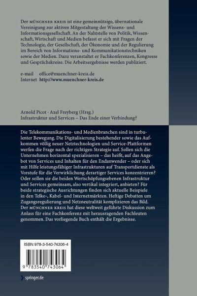 Die Telekommunikations- und Medienbranchen sind in turbulenter Bewegung. Digitalisierung bestehender sowie das Aufkommen völlig neuer Netztechnologien und Service-Plattformen werfen die Frage nach der richtigen Strategie auf. Sollen sich die Unternehmen horizontal spezialisieren -das heißt auf das Angebot von Services und Inhalten für den Endanwender- oder sich mit Hilfe leistungsfähiger Infrastrukturen auf Transportdienste als Vorstufe für die Verwirklichung derartiger Services konzentrieren? Oder sollen sie die beiden Wertschöpfungsebenen Infrastruktur und Services gemeinsam, also vertikal integriert, anbieten? Für beide strategische Ausrichtungen finden sich aktuelle Beispiele in den Telco-, Kabel- und Internetmärkten. Heftige Debatten um Zugangsregulierung und Netzneutralität komplizieren das Bild. Der MÜNCHNER KREIS hat diese weltweit geführte Diskussion zum Anlass für eine Fachkonferenz mit herausragenden Fachleuten genommen. Das vorliegende Buch enthält die Ergebnisse.