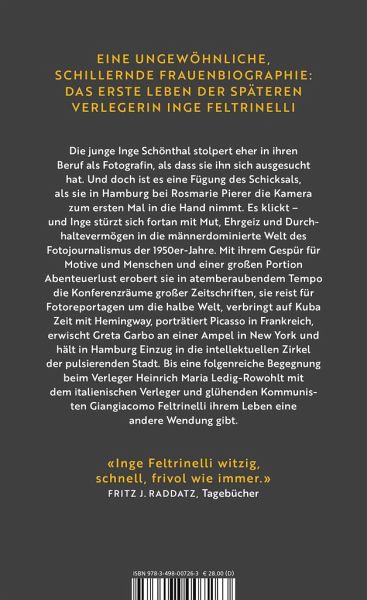 Die junge Inge Schönthal stolpert eher in ihren Beruf als Fotografin, als dass sie ihn sich ausgesucht hat. Und doch ist es eine Fügung des Schicksals, als sie in Hamburg bei Rosmarie Pierer die Kamera zum ersten Mal in die Hand nimmt. Es klickt - und Inge stürzt sich fortan mit Mut, Ehrgeiz und Durchhaltevermögen in die männerdominierte Welt des Fotojournalismus der 1950er-Jahre. Mit ihrem Gespür für Motive und Menschen und einer großen Portion Abenteuerlust erobert sie in atemberaubendem Tempo die Konferenzräume großer Zeitschriften, sie reist für Fotoreportagen um die halbe Welt, verbringt auf Kuba Zeit mit Hemingway, porträtiert Picasso in Frankreich, erwischt Greta Garbo an einer Ampel in New York und hält in Hamburg Einzug in die intellektuellen Zirkel der pulsierenden Stadt. Bis eine folgenreiche Begegnung beim Verleger Heinrich Maria Ledig-Rowohlt mit dem italienischen Verleger und glühenden Kommunisten Giangiacomo Feltrinelli ihrem Leben eine andere Wendung gibt.