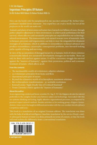The inexhaustible wealth of evolutionary optimal solutions.- Principles of nature or survival in an open "cooking pot".- Multidisciplinary developmental works.- Central operating principles of evolution.- Eight basic biocybernetic rules according to Frederic Vester.- Ways out of the trap of human short-sighted design routines.- Application of basic strategic principles of nature in the human design space.- Application of central operational principles of nature in the human design space.- Eight basic operational biocybernetic rules.