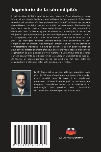 Il est possible de faire pencher certains aspects d'une situation en votre faveur si les bonnes tactiques sont utilisées au bon moment. Créer votre réussite est possible. Ce livre présente plus de 650 tactiques qui peuvent être utilisées pour faire pencher la situation en votre faveur. N'attendez pas pour avoir de la chance. Créez votre hasard. Prenez les informations contenues dans ce livre et ajustez et améliorez vos tactiques et votre style de gestion opérationnelle afin que vos employés puissent s'épanouir. Quand ils prospèrent, vous aussi. S'ils ne le font pas, vous ne le ferez pas non plus. Les managers influents peuvent réussir pour eux-mêmes et pour l'organisation en utilisant des tactiques efficaces et en faisant preuve de comportements inspirants. Ce livre est destiné à être un guide du praticien pour devenir stratégiquement chanceux en créant votre hasard. Placez votre organisation en pole position sur vos marchés. Il vaut mieux être en avance sur ses concurrents que d'essayer de les rattraper. L'objectif de ce livre est de fournir un aperçu pratique de ce qui peut être fait pour aider les organisations à atteindre cette pole position et à y rester.