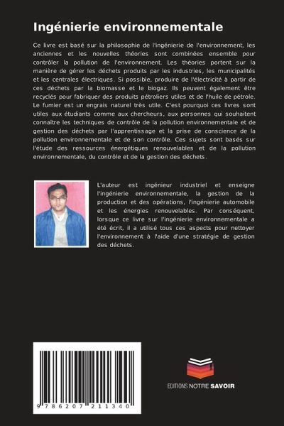 Ce livre est basé sur la philosophie de l'ingénierie de l'environnement, les anciennes et les nouvelles théories sont combinées ensemble pour contrôler la pollution de l'environnement. Les théories portent sur la manière de gérer les déchets produits par les industries, les municipalités et les centrales électriques. Si possible, produire de l'électricité à partir de ces déchets par la biomasse et le biogaz. Ils peuvent également être recyclés pour fabriquer des produits pétroliers utiles et de l'huile de pétrole. Le fumier est un engrais naturel très utile. C'est pourquoi ces livres sont utiles aux étudiants comme aux chercheurs, aux personnes qui souhaitent connaître les techniques de contrôle de la pollution environnementale et de gestion des déchets par l'apprentissage et la prise de conscience de la pollution environnementale et de son contrôle. Ces sujets sont basés sur l'étude des ressources énergétiques renouvelables et de la pollution environnementale, du contrôle et de la gestion des déchets.