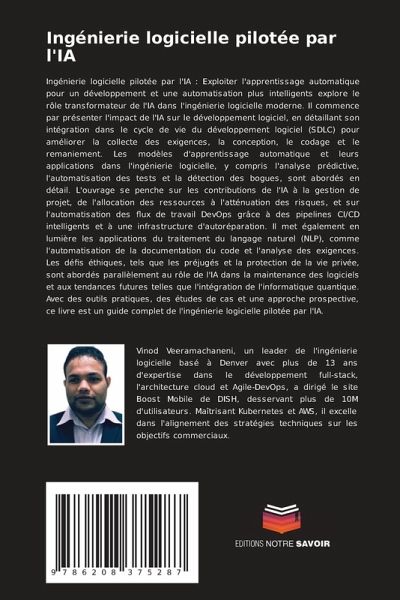 Ingénierie logicielle pilotée par l'IA : Exploiter l'apprentissage automatique pour un développement et une automatisation plus intelligents explore le rôle transformateur de l'IA dans l'ingénierie logicielle moderne. Il commence par présenter l'impact de l'IA sur le développement logiciel, en détaillant son intégration dans le cycle de vie du développement logiciel (SDLC) pour améliorer la collecte des exigences, la conception, le codage et le remaniement. Les modèles d'apprentissage automatique et leurs applications dans l'ingénierie logicielle, y compris l'analyse prédictive, l'automatisation des tests et la détection des bogues, sont abordés en détail. L'ouvrage se penche sur les contributions de l'IA à la gestion de projet, de l'allocation des ressources à l'atténuation des risques, et sur l'automatisation des flux de travail DevOps grâce à des pipelines CI/CD intelligents et à une infrastructure d'autoréparation. Il met également en lumière les applications du traitement du langage naturel (NLP), comme l'automatisation de la documentation du code et l'analyse des exigences. Les défis éthiques, tels que les préjugés et la protection de la vie privée, sont abordés parallèlement au rôle de l'IA dans la maintenance des logiciels et aux tendances futures telles que l'intégration de l'informatique quantique. Avec des outils pratiques, des études de cas et une approche prospective, ce livre est un guide complet de l'ingénierie logicielle pilotée par l'IA.