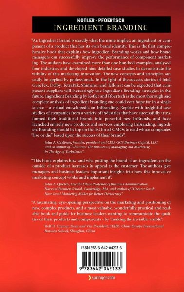 The authors have examined more than one hundred examples, analyzed four industries and developed nine detailed case studies to demonstrate the viability of this marketing innovation. The new concepts and principles can easily be applied by professionals. In the light of the success stories of Intel, GoreTex, Dolby, TetraPak, Shimano, and Teflon it can be expected that component suppliers will increasingly use Ingredient Branding strategies in the future.