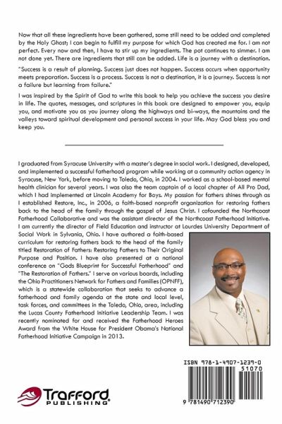 Now that all these ingredients have been gathered, some still need to be added and completed by the Holy Ghost; I can begin to fulfill my purpose for which God has created me for. I am not perfect. Every now and then, I have to stir up my ingredients. The pot continues to simmer. I am not done yet. There are ingredients that still can be added. Life is a journey with a destination. "Success is a result of planning. Success just does not happen. Success occurs when opportunity meets preparation. Success is a process. Success is not a destination, it is a journey. Success is not a failure but learning from failure." I was inspired by the Spirit of God to write this book to help you achieve the success you desire in life. The quotes, messages, and scriptures in this book are designed to empower you, equip you, and motivate you as you journey along the highways and bi-ways, the mountains and the valleys toward spiritual development and personal success in your life. May God bless you and keep you.