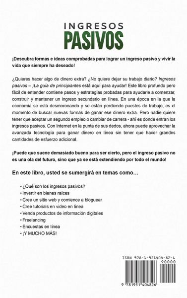 ¡Descubra formas e ideas comprobadas para lograr un ingreso pasivo y vivir la vida que siempre ha deseado! ¿Quieres hacer algo de dinero extra? ¿No quiere dejar su trabajo diario? Ingresos pasivos - ¡La guía de principiantes está aquí para ayudar! Este libro profundo pero fácil de entender contiene pasos y estrategias probadas para ayudarle a comenzar, construir y mantener un ingreso secundario en línea. En una época en la que la economía se está desmoronando y se están perdiendo puestos de trabajo, es el momento de buscar nuevas formas de ganar ese dinero extra. Pero nadie quiere tener que aceptar un segundo empleo o cambiar de carrera - ahí es donde entran los ingresos pasivos. Con Internet en la punta de sus dedos, ahora puede aprovechar la avanzada tecnología para ganar dinero en línea sin tener que hacer grandes cantidades de esfuerzo adicional. ¡Puede que suene demasiado bueno para ser cierto, pero el ingreso pasivo no es una ola del futuro, sino que ya se está extendiendo por todo el mundo! En este libro, usted se sumergirá en temas como… ¿Qué son los ingresos pasivos? Invertir en bienes raíces Cree un sitio web y comience a bloguear Cree tutorials en video en línea Venda productos de información digitales Freelancing Encuestas en línea ¡Y MUCHO MÁS! No esperes la próxima gran oportunidad para atacar. Ya esta aqui! Comience a ganar dinero de la manera más inteligente AHORA!