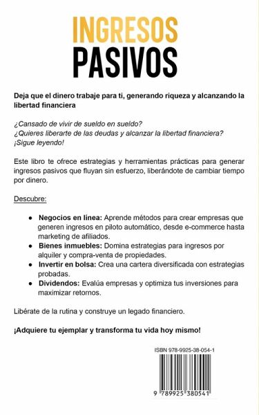 Deja que el dinero trabaje para ti, generando riqueza y alcanzando la libertad financiera ¿Estás cansado de trabajar incansablemente día y noche sólo para vivir de sueldo en sueldo? ¿Quieres liberarte por fin de las cadenas de las deudas y vivir una vida financieramente libre? ¡Entonces, sigue leyendo! Este innovador libro te proporcionará los conocimientos, las estrategias y las herramientas prácticas necesarias para generar ingresos que fluyan sin esfuerzo hacia tu cuenta bancaria, permitiéndote liberarte de las limitaciones que supone cambiar tiempo por dinero. Embárcate en un viaje transformador que explora diversas vías de ingresos pasivos - Desde negocios en línea y emprendedurismo, hasta bienes inmuebles, inversión en bolsa, dividendos y mucho más. Los aspectos más destacados son:Negocios en línea y espíritu empresarial: Descubre métodos probados para crear negocios en línea rentables que generen ingresos en piloto automático. Aprovecha el poder del comercio electrónico, marketing de afiliación, productos digitales y otras empresas en línea para crear flujos de ingresos pasivos sostenibles. Bienes inmuebles: Descubre las estrategias y técnicas utilizadas por inversores inmobiliarios experimentados para generar ingresos pasivos a través del alquiler de propiedades, las sindicaciones inmobiliarias y la compra-venta de propiedades. Identifica oportunidades lucrativas, mitiga riesgos y construye una cartera inmobiliaria rentable. Invertir en bolsa: Navega por el mundo de la inversión bursátil y aprende a construir una cartera de inversiones diversificada que genere ingresos pasivos. Adquiere conocimientos sobre estrategias y técnicas de inversión de éxito que han superado la prueba del tiempo. Invertir en dividendos: Aprende a evaluar las empresas que pagan dividendos, a crear una cartera de dividendos y a optimizar tus inversiones para maximizar la rentabilidad. Tanto si quieres escapar de la rutina de 9 a 5, asegurar tu jubilación o crear un legado para las generaciones futuras, esta guía te proporcionará los conocimientos y estrategias necesarios para liberar el verdadero potencial de los ingresos pasivos. ¡Consigue tu ejemplar hoy mismo y comienza a transformar tu vida financiera!