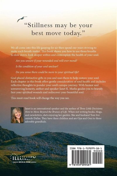 We all come into this life gasping for air then spend our years striving to make each breath matter. This book shows you how to use those breaths to slow down, look deeper within and contemplate the health of your soul. Are you unsure if your wounded soul will ever mend? Is the condition of your soul unclear? Do you sense there could be more to your spiritual life? God placed distinctive gifts in you and uses them to help restore your soul. Each chapter in this book offers gentle consideration of soul health and includes reflective thoughts to ponder your soul's unique journey. With humor and unwavering honesty, author and speaker Janet K. Marks guides you to bravely face your spiritual wounds and rediscover your beautiful soul. This must-read book will change the way you see.
