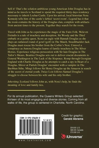 Sell it! That s the solution ambitions young American John Douglas has in mind as he travels to Scotland to spend the required thirty days residency necessary to inherit Lochar Castle. Upon his arrival, local historian Nora Kennedy tells him of the castle s fabled secret room . Legend has it that the room contains the history of the Douglas clan, complete with artifacts from ancient times to the present. Together they search for the room. Travel with John as he experiences the magic of the Faire Folk. Welcvm Freindis is a tale of treachery and deception. Sir Woody and the Thief embark on a quirky quest. Score an eagle with Hannah Douglas as she plays an outlawed round of gowf (golf) in The Match. Swashbuckler Jack Douglas must rescue his brother from the Corbie s Nest. Unravel a conspiracy as Annora Douglas learns of family treachery in The Silver Horses. Experience religious persecution with Sir Iain Douglas in The Tailor s Shears. Beatrice Douglas sets out to deliver crucial documents to General Washington in The Luck of the Sixpence. Romp through Georgian England with Charlie Douglas as he attempts to catch a spy in Heart of a Douglas. Shiver at Patrick Douglas encounter with a vampire in The Baobhan Sithe. Mingi follows Sir Henry Douglas up the Amazon in search of the secret of eternal youth. Twice Lost follows Samuel Douglas s struggle to choose between his wife and his only brother. Inheriting Scotland follows John as, with Nora s help, he finds the meaning of love and family ties.