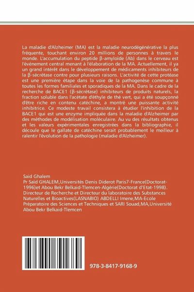 La maladie d'Alzheimer (MA) est la maladie neurodégénérative la plus fréquente, touchant environ 20 millions de personnes à travers le monde. L'accumulation du peptide -amyloïde (Ab) dans le cerveau est l'événement central menant à l'élaboration de la MA. Actuellement, il ya un grand intérêt dans le développement de médicaments inhibiteurs de la -sécrétase contre pour plusieurs raisons. L'activité de cette protéase est une première étape dans la voie de la pathogenèse commune à toutes les formes familiales et sporadiques de la MA. Dans le cadre de la recherche de BACE1 ( -sécrétase) inhibiteurs de produits naturels, la fraction soluble dans l'acétate d'éthyle de thé vert, qui a été soupçonné d'être riche en contenu catéchine, a montré une puissante activité inhibitrice. Ce modeste travail consistera à étudier l'inhibition de la BACE1 qui est une enzyme impliquée dans la maladie d'Alzheimer par des méthodes de modélisation moléculaire. Au vu des résultats obtenus et les valeurs expérimentales enregistrées dans la bibliographie, il découle que le gallate de catéchine serait probablement le meilleur à ralentir l'évolution de la pathologie (maladie d'Alzheimer).