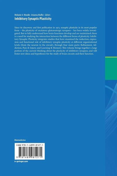 Refinement.The many faces of inhibitory plasticity: adding flexibility to cortical circuits throughout development.Long-term modification at inhibitory synapses in developing visual cortex.Molecular Mechanism of Long-Term Plasticity at Cerebellar Inhibitory Synapses. Inhibitory plasticity and auditory function.- Addiction.VTA GABAergic Plasticity: An Inhibitory Synaptic Model of Drug Addiction.Midbrain Dopamine Neurons: Implications for the Development of Alcohol-Seeking Behaviors.- Pain and Injury.Mechanisms of plasticity of inhibition in chronic pain conditions.Injury induced epileptogenesis: Contribution of active inhibition, disfacilitation and deafferentation to seizure induction in thalamocortical system. Cellular Mechanisms of Neuronal Cl- Homeostasis and its Modulation by Neuronal Injury.- Learning and Memory.Activity-Dependent Inhibitory Synaptic Plasticity Mediated by Chloride Regulation.Endocannabinoid mediated long-term depression at inhibitory synapses.Inhibitory Synaptic Plasticity & Neurotrophins.