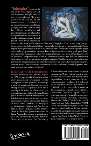 "Inhóspito" es una novela con mucho sexo, drogas y rock and roll. Se cuentan múltiples historias sobre el narcotráfico en Monterrey y en Dallas, ciudades base de esta inmensa enredadera de lujuria. Por un lado, en Monterrey, están Natalia y Miguel, por el otro, en Dallas, están Paco y Monet. La realidad es cruel para estos personajes. Su vida cambia vertiginosamente de un momento a otro. La acción es constante, desde el principio hasta el final. El dinero, la violencia y los excesos, son las vitaminas de la trama. El lenguaje es duro. Las balaceras y la sangre, corren como potros desbocados a lo largo y ancho de las historias que se entrelazan día a día. Puedes respirar el aire que se respira al cruzar el Río Bravo de forma clandestina. Puedes aspirar las drogas que todos los gringos aspiran en los antros. Puedes disparar, mentir, traicionar, gemir, gritar, llorar, reír, jugar, correr, sangrar, amar y odiar. Pero no puedes dejar de vivir y morir. Desde el primer verso de "Inhóspito", comprenderás que te subiste a una enorme montaña rusa, de la cual no te querrás bajar, aunque el dolor te rompa y rasgue, página tras página. Esta historia no es recomendable para personas con una buena conciencia, los efectos secundarios son severos. Esta historia es una guerra, externa e interna. Si no deseas tener convulsiones mentales, no leas esta historia, después de todo, nadie quiere vivir en un lugar "inhóspito".