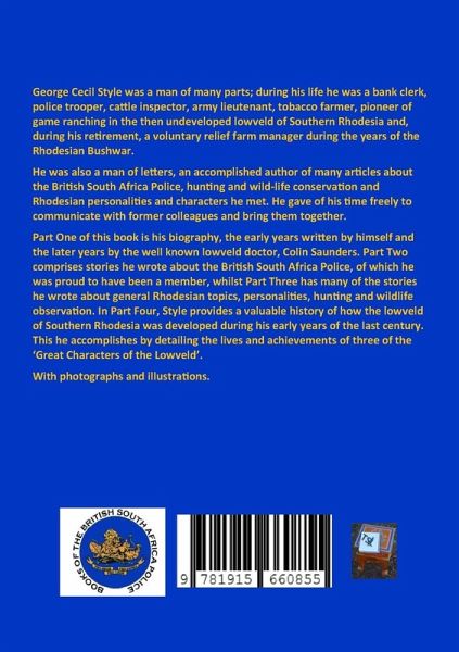 George Cecil Style was a man of many parts; during his life he was a bank clerk, police trooper, cattle inspector, army lieutenant, tobacco farmer, pioneer of game ranching in the then undeveloped lowveld of Southern Rhodesia and, during his retirement, a voluntary relief farm manager during the years of the Rhodesian Bushwar. He was also a man of letters, an accomplished author of many articles about the British South Africa Police, hunting and wild-life conservation and Rhodesian personalities and characters he met. He gave of his time freely to communicate with former colleagues and bring them together. Part One of this book is his biography, the early years written by himself and the later years by the well known lowveld doctor, Colin Saunders. Part Two comprises stories he wrote about the British South Africa Police, of which he was proud to have been a member, whilst Part Three has many of the stories he wrote about general Rhodesian topics, personalities, hunting and wildlife observation. In Part Four, Style provides a valuable history of how the lowveld of Southern Rhodesia was developed during his early years of the last century. This he accomplishes by detailing the lives and achievements of three of the 'Great Characters of the Lowveld'. With photographs and illustrations.
