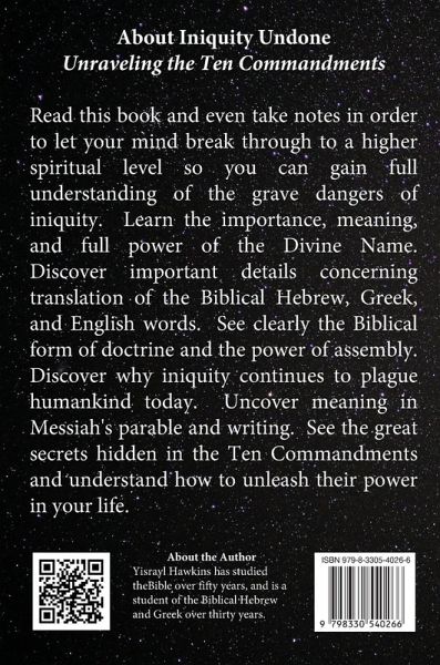 Read this book and even take notes in order to let your mind break through to a higher spiritual level so you can gain full understanding of the grave dangers of iniquity. Learn the importance, meaning, and full power of the Divine Name. Discover important details concerning translation of the Biblical Hebrew, Greek, and English words. See clearly the Biblical form of doctrine and the power of assembly. Discover why iniquity continues to plague humankind today. Uncover meaning in Messiah's parable and writing. See the great secrets hidden in the Ten Commandments and understand how to unleash their power in your life.