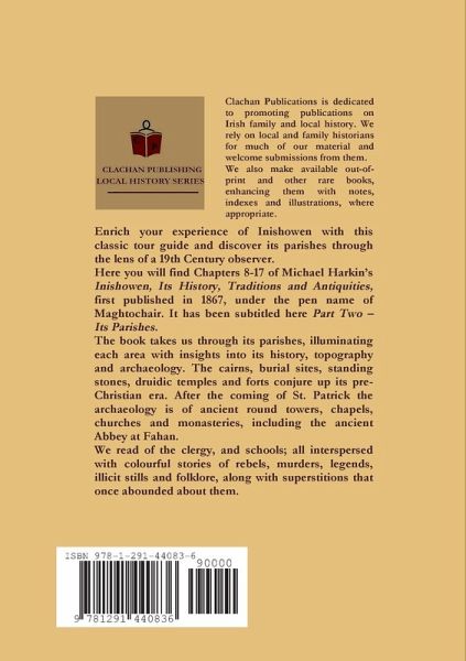 This edition presents the those chapters of 'Inishowen, Its History, Traditions and Antiquities' which deal with its parishes, first published by Michael Harkin in 1867 under the pen name of Maghtochair. Each parish is illuminated with insights into its history, topography and archaeology. The cairns, burial sites, standing stones, druidic temples and forts conjure up its pre-Christian era. After the coming of St. Patrick the archaeology is of ancient round towers, chapels, churches and monasteries, including the ancient Abbey at Fahan. We read of the clergy, and schools; all interspersed with colourful stories of rebels, murders, legends, illicit stills and folklore, along with superstitions that once abounded about them.