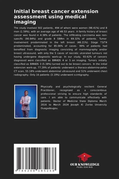 The study involved 502 patients, 494 of whom were women (98.41%) and 8 men (1.59%), with an average age of 48.53 years. A family history of breast cancer was found in 4.38% of patients. The infiltrating carcinoma was non-specific (90.84%) and grade II SBRm in 69.32% of patients. Tumor involvement predominated in the left breast (48.21%). Stage T3/T4 predominated, accounting for 85.06% of cases. 99% of patients had benefited from diagnostic imaging consisting of mammography and/or breast ultrasound, with only the 5 cases of necrotic ulcerated tumours not having undergone diagnostic work-up. In our study, 93.62% of cancers diagnosed were classified as BIRADS 4 or 5 on imaging. Tumors initially classified as BIRADS 3 (5.38%) turned out to be breast cancers. In the initial extension work-up, 77.29% of patients underwent a thoraco-abdomino-pelvic CT scan, 55.18% underwent abdominal ultrasound and 51% underwent chest radiography. Only 16 patients (3.19%) underwent scintigraphy.