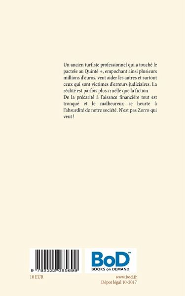 Un ancien turfiste professionnel qui a touché le pactole au Quinté +, empochant ainsi plusieurs millions d'euros, veut aider les autres et surtout ceux qui sont victimes d'erreurs judiciaires. La réalité est parfois plus cruelle que la fiction.De la précarité à l'aisance financière tout est tronqué et le malheureux se heurte à l'absurdité de notre société. N'est pas Zorro qui veut !