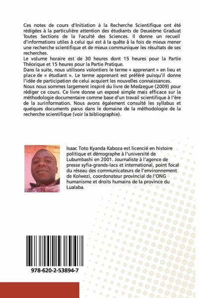 Ces notes de cours d'Initiation à la Recherche Scientifique ont été rédigées à la particulière attention des étudiants de Deuxième Graduat Toutes Sections de la Faculté des Sciences. Il donne un recueil d'informations utiles à celui qui est à la quête à la fois de mieux mener une recherche scientifique et de mieux communiquer les résultats de ses recherches.Le volume horaire est de 30 heures dont 15 heures pour la Partie Théorique et 15 heures pour la Partie Pratique.Dans la suite, nous utilisons volontiers le terme « apprenant » en lieu et place de « étudiant ». Le terme apprenant est préféré puisqu'il donne l'idée de participation de celui acquiert les nouvelles connaissances.Nous nous sommes largement inspiré du livre de Medzegue (2009) pour rédiger ce cours. Ce livre donne un exposé simple mais efficace sur la méthodologie documentaire comme base d'un travail scientifique à l'ère de la surinformation. Nous avons également consulté les syllabus et quelques documents parus dans le domaine de la méthodologie de la recherche scientifique (voir la bibliographie).