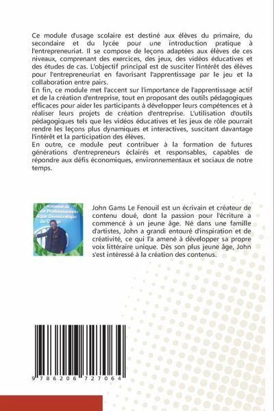 Ce module d'usage scolaire est destiné aux élèves du primaire, du secondaire et du lycée pour une introduction pratique à l'entrepreneuriat. Il se compose de leçons adaptées aux élèves de ces niveaux, comprenant des exercices, des jeux, des vidéos éducatives et des études de cas. L'objectif principal est de susciter l'intérêt des élèves pour l'entrepreneuriat en favorisant l'apprentissage par le jeu et la collaboration entre pairs.En fin, ce module met l'accent sur l'importance de l'apprentissage actif et de la création d'entreprise, tout en proposant des outils pédagogiques efficaces pour aider les participants à développer leurs compétences et à réaliser leurs projets de création d'entreprise. L'utilisation d'outils pédagogiques tels que les vidéos éducatives et les jeux de rôle pourrait rendre les leçons plus dynamiques et interactives, suscitant davantage l'intérêt et la participation des élèves.En outre, ce module peut contribuer à la formation de futures générations d'entrepreneurs éclairés et responsables, capables de répondre aux défis économiques, environnementaux et sociaux de notre temps.