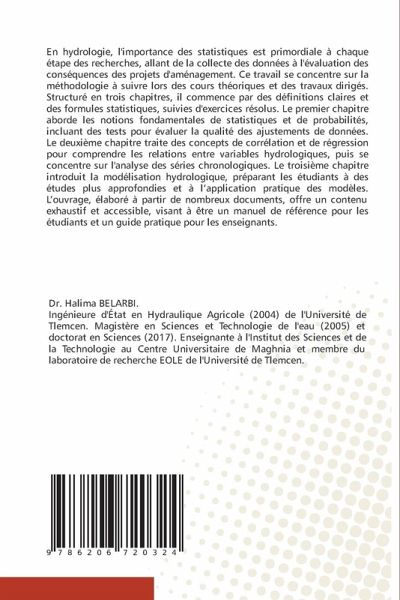 En hydrologie, l'importance des statistiques est primordiale à chaque étape des recherches, allant de la collecte des données à l'évaluation des conséquences des projets d'aménagement. Ce travail se concentre sur la méthodologie à suivre lors des cours théoriques et des travaux dirigés. Structuré en trois chapitres, il commence par des définitions claires et des formules statistiques, suivies d'exercices résolus. Le premier chapitre aborde les notions fondamentales de statistiques et de probabilités, incluant des tests pour évaluer la qualité des ajustements de données. Le deuxième chapitre traite des concepts de corrélation et de régression pour comprendre les relations entre variables hydrologiques, puis se concentre sur l'analyse des séries chronologiques. Le troisième chapitre introduit la modélisation hydrologique, préparant les étudiants à des études plus approfondies et à l'application pratique des modèles. L'ouvrage, élaboré à partir de nombreux documents, offre un contenu exhaustif et accessible, visant à être un manuel de référence pour les étudiants et un guide pratique pour les enseignants.