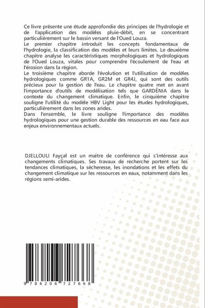 Ce livre présente une étude approfondie des principes de l'hydrologie et de l'application des modèles pluie-débit, en se concentrant particulièrement sur le bassin versant de l'Oued Louza.Le premier chapitre introduit les concepts fondamentaux de l'hydrologie, la classification des modèles et leurs limites. Le deuxième chapitre analyse les caractéristiques morphologiques et hydrologiques de l'Oued Louza, vitales pour comprendre l'écoulement de l'eau et l'érosion dans la région.Le troisième chapitre aborde l'évolution et l'utilisation de modèles hydrologiques comme GR1A, GR2M et GR4J, qui sont des outils précieux pour la gestion de l'eau. Le chapitre quatre met en avant l'importance d'outils de modélisation tels que GARDÉNIA dans le contexte du changement climatique. Enfin, le cinquième chapitre souligne l'utilité du modèle HBV Light pour les études hydrologiques, particulièrement dans les zones arides.Dans l'ensemble, le livre souligne l'importance des modèles hydrologiques pour une gestion durable des ressources en eau face aux enjeux environnementaux actuels.