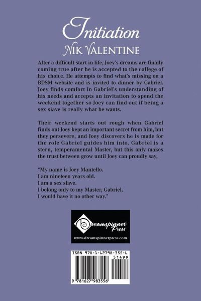After a difficult start in life, Joey's dreams are finally coming true after he is accepted to the college of his choice. He attempts to find what's missing on a BDSM website and is invited to dinner by Gabriel. Joey finds comfort in Gabriel's understanding of his needs and accepts an invitation to spend the weekend together so Joey can find out if being a sex slave is really what he wants. Their weekend starts out rough when Gabriel finds out Joey kept an important secret from him, but they persevere, and Joey discovers he is made for the role Gabriel guides him into. Gabriel is a stern,…mehr