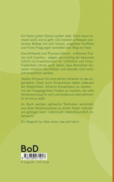 Ein freies Leben führen wollen viele. Doch kaum jemand weiß, wie es geht. Die meisten schleppen seelischen Ballast mit sich herum, ungelöste Konflikte und frühe Prägungen verstellen den Weg ins Freie. Ewa Willaredt und Thomas Schmid - erfahrene Trainer und Coaches - zeigen, wie wichtig der bewusste Schritt ins Erwachsensein ist: Unfreiheit und Unzufriedenheit rühren auch daher, dass Menschen keinerlei Initiation durchleben und deshalb nicht wirklich erwachsen werden. Idealer Zeitraum für eine solche Initiation ist das Jugendalter. Doch auch Erwachsene haben jederzeit die Möglichkeit, initiierte Erwachsene zu werden - mit der Vergangenheit Frieden zu machen, die volle Verantwortung für sich und andere zu übernehmen. Es ist nie zu spät!Im Buch werden zahlreiche Techniken vermittelt, wie diese Metamorphose zu einem freien Individuum gelingen kann. Lebensnah, lebensfreundlich, lebensecht. Ein Wagnis? Ja. Aber eines, das sich lohnt.