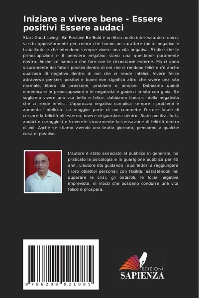Start Good Living - Be Positive Be Bold è un libro molto interessante e unico, scritto appositamente per coloro che hanno un carattere molto negativo e traballante e che intendono sempre vivere una vita negativa. Si dice che le preoccupazioni e il pensiero negativo siano una questione puramente nostra. Anche se hanno a che fare con le circostanze esterne. Ma ci sono sicuramente dei fattori positivi dentro di noi che ci rendono felici e c'è anche qualcosa di negativo dentro di noi che ci rende infelici. Vivere felice attraverso pensieri positivi e buoni non significa altro che vivere una vita normale, libera da pressioni, problemi e tensioni. Dobbiamo quindi dimenticare le preoccupazioni e le negatività e goderci la vita con gioia. Se vogliamo vivere una vita bella e felice, dobbiamo liberarci della negatività che ci rende infelici. L'approccio negativo complica sempre i problemi e aumenta l'infelicità. La maggior parte di noi commette l'errore fatale di cercare la felicità all'esterno, invece di guardarsi dentro. Siate positivi, forti, audaci e coraggiosi e troverete sicuramente la sensazione di felicità dentro di voi. Anche se stiamo vivendo una brutta giornata, pensiamo a qualche cosa di positivo.