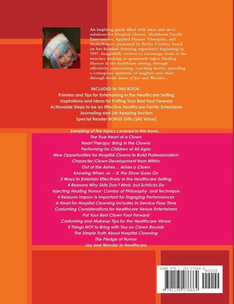 An inspiring guide filled with ideas and savvy solutions for Hospital Clowns, Healthcare Family Entertainers, Applied Humor Therapists, and SmileMakers, by Becky Cortino, based on her almost 14 years of hospital clowning experience, beginning in 1997. Insightfully written to encourage those in the trenches desiring to generously inject Healing Humor in the healthcare setting, through effectively entertaining, touching hearts, spreading a contagious epidemic of laughter and cheer through lavish doses of Joy and Wonder! *Pointers and Tips for Entertaining in Healthcare Setting *Inspirations and Ideas for Putting Your Best Foot Forward *Actionable Steps to be an Effective Healthcare Family Entertainer *Journaling and List-keeping Section *Special Reader BONUS Gifts ($45 Value)