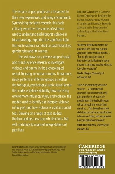 The remains of past people are a testament to their lived experiences and of the environment in which they lived. Synthesising the latest research, this book critically examines the sources of evidence used to understand and interpret violence in bioarchaeology, exploring the significant light such evidence can shed on past hierarchies, gender roles and life courses. The text draws on a diverse range of social and clinical science research to investigate violence and trauma in the archaeological record, focussing on human remains. It examines injury patterns in different groups as well as the biological, psychological and cultural factors that make us behave violently, how our living environment influences injury and violence, the models used to identify and interpret violence in the past, and how violence is used as a social tool. Drawing on a range of case studies, Redfern explores new research directions that will contribute to nuanced interpretations of past lives.