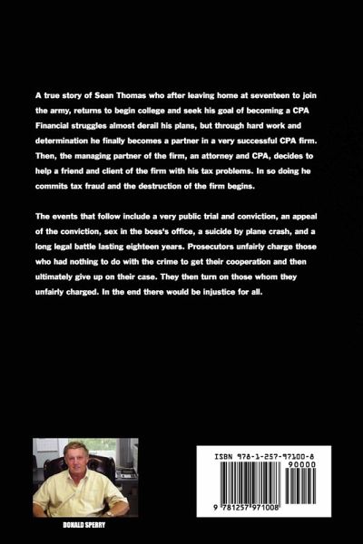A true story of Sean Thomas who after leavintg home at seventeen to join the army, returns to begin college and seek his goal of becoming a C.P.A. Financial struggles almost derail his plans, but through hard work and determination he finally becomes a partner in a very successful C.P.A. firm. Then the managing partner of the firm, an attorney and C.P.A. decides to help a friend and client of the firm with his tax problems and in so doing commits tax fraud and the distruction of the firm begins. The events that follow include a very public trial and conviction, an appeal of the conviction, sex in the boss's office, suicide by plane crash and a long legal battle lasting eighteen years. Prosecutors unfairly charge those who had nothing to do with the crime to get their co-operation and ultimately give up on their case. They then fight those who they unfairlyi charged. In the end there would be injustice for all.