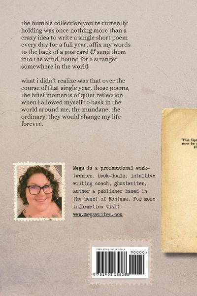 the humble collection you're currently holding was once nothing more than a crazy idea to write a single short poem every day for a full year, affix my words to the back of a postcard & send them into the wind, bound for a stranger somewhere in the world. what i didn't realize was that over the course of that single year, those poems, the brief moments of quiet reflection when i allowed myself to bask in the world around me, the mundane, the ordinary, they would change my life forever.
