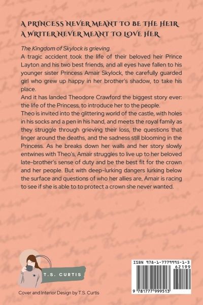 A princess never meant to be heir... A writer never meant to love her...¿¿ The Kingdom of Skylock is grieving. A tragic accident took the life of their beloved heir Prince Layton and his two best friends, and all eyes have fallen to his younger sister Princess Amair Skylock, the carefully guarded girl who grew up happy in her brother's shadow, to take his place. And it has landed Theodore Crawford the biggest story ever: the life of the Princess, to introduce her to the people. Theo is invited into the glittering world of the castle, with holes in his socks and a pen in his hand, and meets the royal family as they struggle through grieving their loss, the questions that linger around the deaths, and the sadness still blooming in the Princess. As he breaks down her walls and her story slowly entwines with Theo's, Amair struggles to live up to her beloved late-brother's sense of duty and be the best fit for the crown and her people. But with deep-lurking dangers below the surface and questions of who her allies are, Amair is racing to see if she is able to to protect a crown she never wanted.