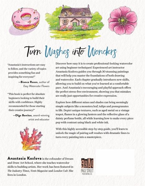 Learn how to master the popular art style of ink and watercolor sketching with this practical how-to book from seasoned watercolor teacher Anastasia Kozlova. Anastasia's unique artistic style, where she draws with pen and then layers watercolor, makes it easy for anyone to create vibrant and crisp pieces that look professional. Beginners will love how the fineliner outlines avoid the tricky nuances of loose watercolor, making painting as easy as filling in a coloring page. With years of experience, Anastasia has carefully curated each lesson to anticipate a beginner's every question. Each project will teach readers a new technique so they can build their skills bit by bit, while still allowing them to finish the day with a new masterpiece they can be proud of. With this highly accessible, 30-day guide, even the most skeptical beginner can learn to create stunning ink and wash drawings.