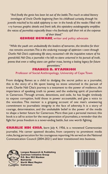 From dodging flames as a child to dodging the secret police as a journalist, this is the story of a life spent leaving no stone unturned in the pursuit of truth. Charlie Ndi Chia's journey is a testament to the power of resilience, the importance of speaking truth to power, and the enduring spirit of journalism in Cameroon. Through arrests, detentions, and exile, he has fought tirelessly to expose corruption, hold those in power accountable, and give a voice to the voiceless. This memoir is a gripping account of one man's unwavering commitment to journalistic integrity in the face of adversity. It is a story of courage, determination, and the unshakable belief in the power of the media to shape a better future for Cameroon. More than just a personal memoir, this book is a call to action for the next generation of journalists, a reminder that the fight for press freedom is a never-ending battle, but one worth fighting. "And finally the genie has been let out of the bottle. The much awaited literary travelogue of Uncle Charlie beginning from his childhood curiosity, through his juvenile mischief to his adult epiphany is now in the hands of the reader. Filled with wry humour, graphic details and frank talk, this epistolary autobiography amplifies the voices of journalists especially those who fearlessly spill their ink at the expense of their blood." George Ngwane, writer and policy advocate "While the youth are undoubtedly the leaders of tomorrow, the timeline for their rise remains uncertain. This is the enduring message of optimism woven through Charlie Ndi Chia's captivating life story, recounted with the inquisitive nature of his grandchild. Ndi Chia, a journalist who left no stone unturned in his pursuit of truth, proves that even a rolling stone can gather moss, leaving a lasting legacy for future generations." Francis B. Nyamnjoh, Professor of Social Anthropology, University of Cape Town