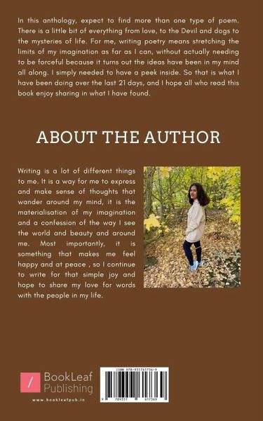 In this anthology, expect to find more than one type of poem. There is a little bit of everything from love, to the Devil and dogs to the mysteries of life. For me, writing poetry means stretching the limits of my imagination as far as I can, without actually needing to be forceful because it turns out the ideas have been in my mind all along. I simply needed to have a peek inside. So that is what I have been doing over the last 21 days, and I hope all who read this book enjoy sharing in what I have found.