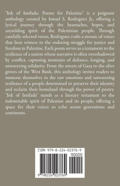 "Ink of Intifada: Poems for Palestine" is a poignant anthology curated by Ismael S. Rodriguez Jr., offering a lyrical journey through the heartaches, hopes, and unyielding spirit of the Palestinian people. Through carefully selected verses, Rodriguez crafts a mosaic of voices that bear witness to the enduring struggle for justice and freedom in Palestine. Each poem serves as a testament to the resilience of a nation whose narrative is often overshadowed by conflict, capturing moments of defiance, longing, and unwavering solidarity. From the streets of Gaza to the olive groves of the West Bank, this anthology invites readers to immerse themselves in the raw emotions and unwavering resilience of a people determined to preserve their identity and reclaim their homeland through the power of poetry. "Ink of Intifada" stands as a literary testament to the indomitable spirit of Palestine and its people, offering a space for their voices to echo across generations and continents.