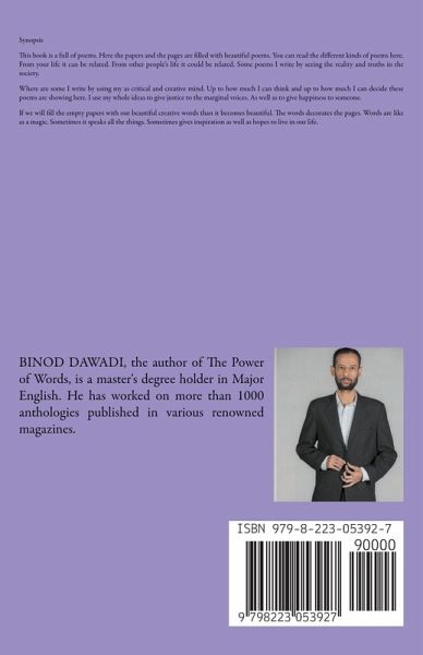 Synopsis This book is a full of poems. Here the papers and the pages are filled with beautiful poems. You can read the different kinds of poems here. From your life it can be related. From other people's life it could be related. Some poems I write by seeing the reality and truths in the society. Where are some I write by using my as critical and creative mind. Up to how much I can think and up to how much I can decide these poems are showing here. I use my whole ideas to give justice to the marginal voices. As well as to give happiness to someone. If we will fill the empty papers with our beautiful creative words than it becomes beautiful. The words decorates the pages. Words are like as a magic. Sometimes it speaks all the things. Sometimes gives inspiration as well as hopes to live in our life.