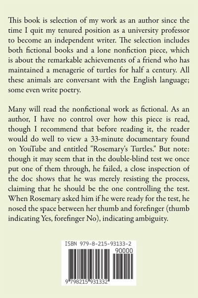 This book is selection of my work as an author since the time I quit my tenured position as a university professor to become an independent writer. The selection includes both fictional books and a lone nonfiction piece, which is about the remarkable achievements of a friend who has maintained a menagerie of turtles for half a century. All these animals are conversant with the English language; some even write poetry. Many will read the nonfictional work as fictional. As an author, I have no control over how this piece is read, though I recommend that before reading it, the reader would do well to view a 33-minute documentary found on YouTube and entitled "Rosemary's Turtles." But note: though it may seem that in the double-blind test we once put one of them through, he failed, a close inspection of the doc shows that he was merely resisting the process, claiming that he should be the one controlling the test. When Rosemary asked him if he were ready for the test, he nosed the space between her thumb and forefinger (thumb indicating Yes, forefinger No), indicating ambiguity.