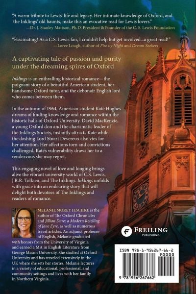 A captivating tale of passion and purity under the dreaming spires of Oxford Inklings is an enthralling historical romance--the poignant story of a beautiful American student, her handsome Oxford tutor, and the debonair English lord who comes between them. ¿ In the autumn of 1964, American student Kate Hughes dreams of finding knowledge and romance within the historic halls of Oxford University. David MacKenzie, a young Oxford don and the charismatic leader of the Inklings Society, instantly attracts Kate while the dashing Lord Stuart Devereux also vies for her attention. Her affections torn and convictions challenged, Kate's vulnerability draws her to a rendezvous she may regret. This engaging novel of love and longing brings alive the vibrant university world of C.S. Lewis, J.R.R. Tolkien, and The Inklings. Inklings unfolds with grace into an endearing story that will delight both devotees of The Inklings and readers of romance.